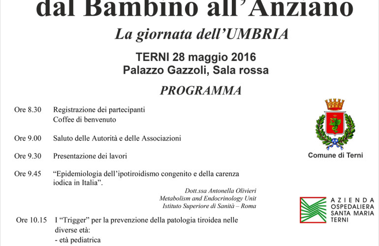 Nell'ambito della "2016 International Thyroid Awareness Week" - "Settimana Mondiale della Tiroide (SMT) 2016" la Sala Rossa del Palazzo Gazzoli nel cuore di Terni (Umbria, Valnerina del Sud) ospiterà un incontro pubblico il 28 Maggio dal titolo "La Tiroide: dal Bambino all'Anziano - La giornata dell'Umbria".