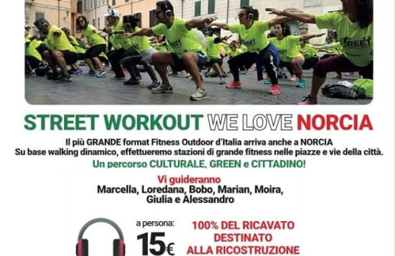 Ad organizzare la Street Workout We Love Norcia ci penseranno Umbria Move, Unique Fitness e Salute, Piscine dello Stadio, MSP Italia e Street Workout Italia. Il percorso al seguito degli istruttori selezionati, partirà alle dieci della mattina dal parcheggio di fronte Cafè Parigi, per poi dirigersi verso via della Stazione, via Roma, per arrivare in piazza del Teatro, dove gli istruttori chiederanno ai partecipanti il primo quarto d'ora di attività fitness, su base walking dinamico (ogni stazione prevede 15' di esercizi a corpo libero). Ma si riprenderà alla svelta per scendere verso corso Sertorio, via Foscolo e per poi uscire dalle mura. E così via per arrivare all'ultima "stazione" in Piazza san Benedetto per gli ultimi quindici minuti di fitness.