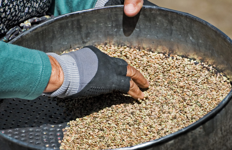 Nella foto: pulitura della lenticchia di Castelluccio di Norcia. Castelluccio di Norcia, Norcia, Perugia.